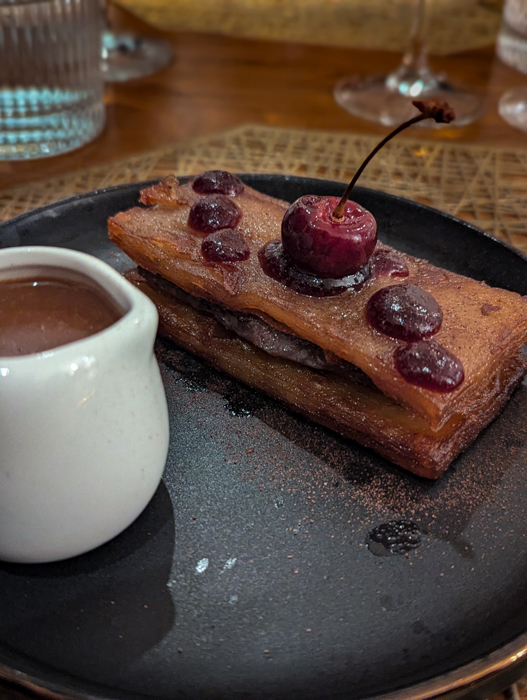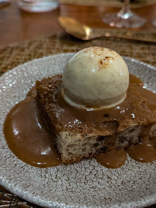 Whether it’s my affinity towards Wales, my love of cheese or both, the third course was my favourite. On the plate was what very much looked like sticky toffee pudding. There’s a dense-looking, rectangular bread base, a thick, brown sauce and a perfect scoop of ice cream on top. But foiled again! The bread was a toasted focaccia. The sauce was rarebit gravy, and the ice cream was a black bomber cheddar cheese gelato. Comforting and divine.